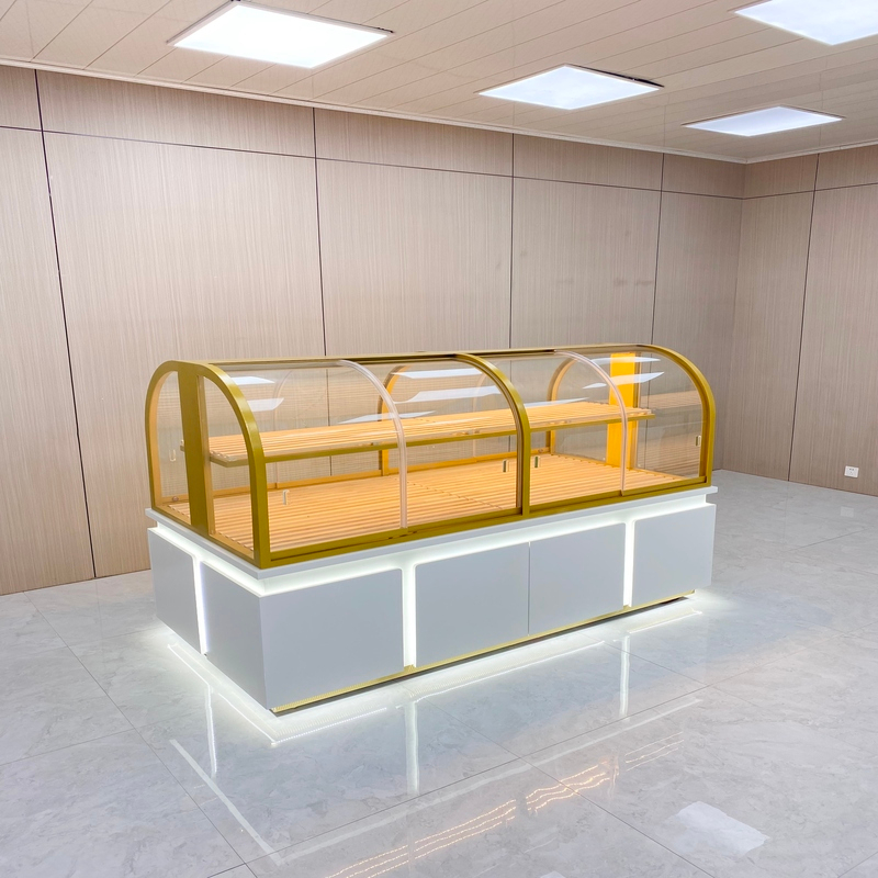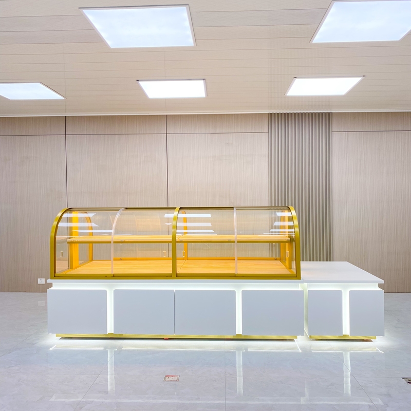 Dans les boulangeries et pâtisseries haut de gamme spécialisées dans les pains et pâtisseries artisanaux, les armoires d'affichage à pain à l'île courbe servent de point focal fonctionnel et visuellement magnifique. Leur design incurvé ajoute une touche d'élégance et de sophistication, tandis que la finition lumineuse améliore l'attrait visuel des pains et pâtisseries affichés. Cela attire non seulement les clients, mais élève également leur expérience d'achat.