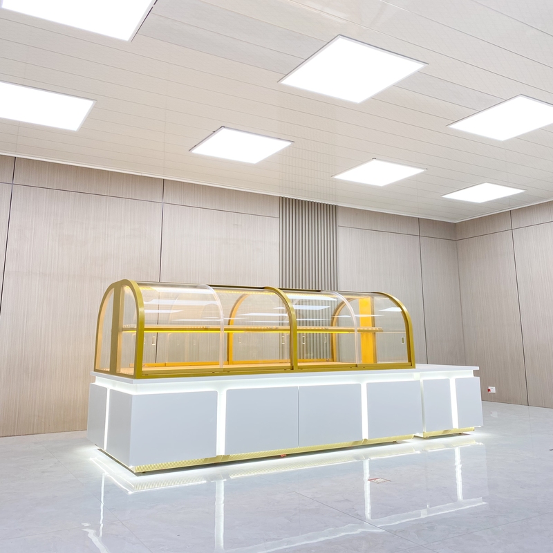 Jinxi Hongzhan Furniture Co., Ltd. est une entreprise dédiée à la conception et à la construction de stands d'affichage à gâteaux, aux stands de pain, aux vitrines de stockage à froid, aux vitrines en verre pour les bijoux et aux lustres de magasins de vêtements. Notre usine couvre une superficie de 2 000 mètres carrés. Nous avons une connaissance approfondie du travail du bois, de la peinture et de la fabrication en acier inoxydable. Notre équipe de design connaît bien. En tant qu'usine complète se concentrant sur les étalages de milieu à haut de gamme, avec 18 ans de pratique et un engagement envers la satisfaction des clients, nous avons affiné nos compétences pour offrir un service exceptionnel.