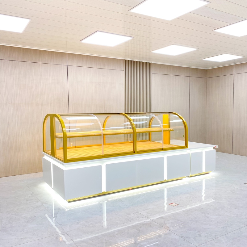Armoire d'affichage à pain à île courbe: dispose d'un avant ou d'un périmètre incurvé, qui peut ajouter un élément unique et visuellement attrayant à la disposition du magasin. La courbure peut faire ressortir l'armoire et attirer l'attention sur les produits de pain affichés.