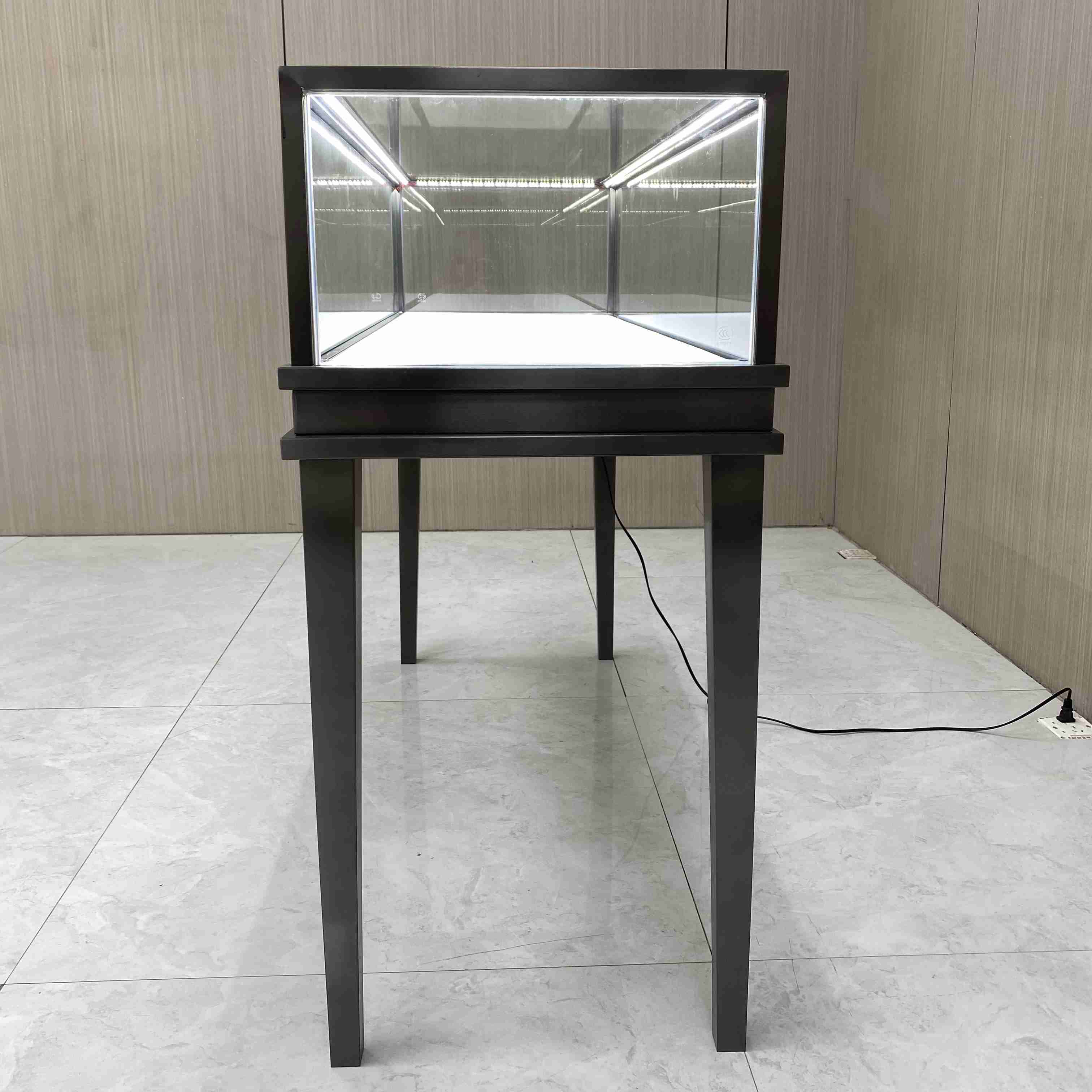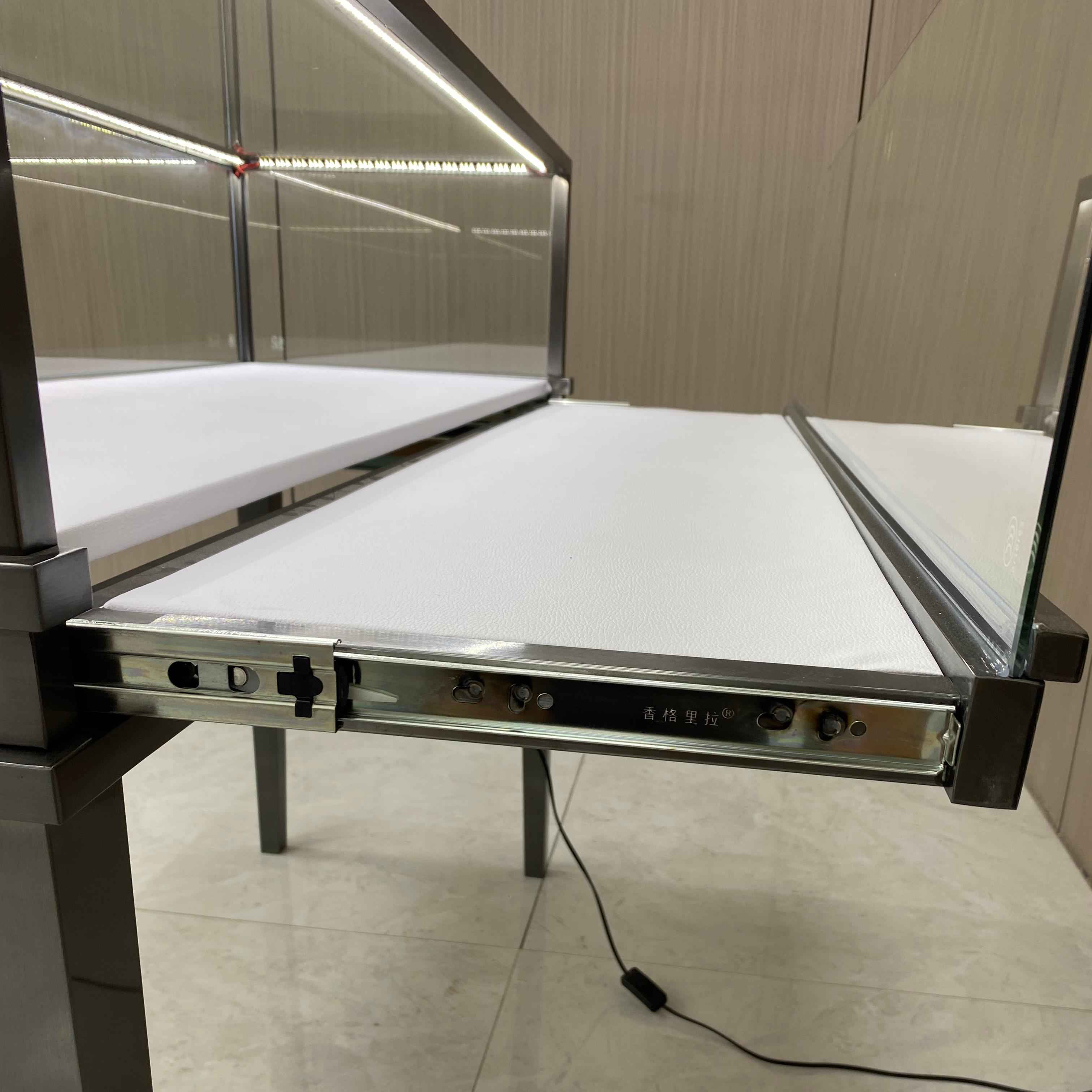 Notre armoire de bijoux en acier inoxydable est une combinaison parfaite de mode et de praticité. La taille est L120 * W55 * H95CM.Il dispose d'une finition brossée en acier inoxydable en titane en titane noir, associée à un verre trempé transparent 8 mm, et l'intérieur est doublé de cuir PU blanc, dégageant de luxe. Il est spécialement conçu pour les ventes commerciales et convient au marché français. Si vous recherchez une armoire d'affichage de bijoux de haute qualité, c'est votre choix idéal.