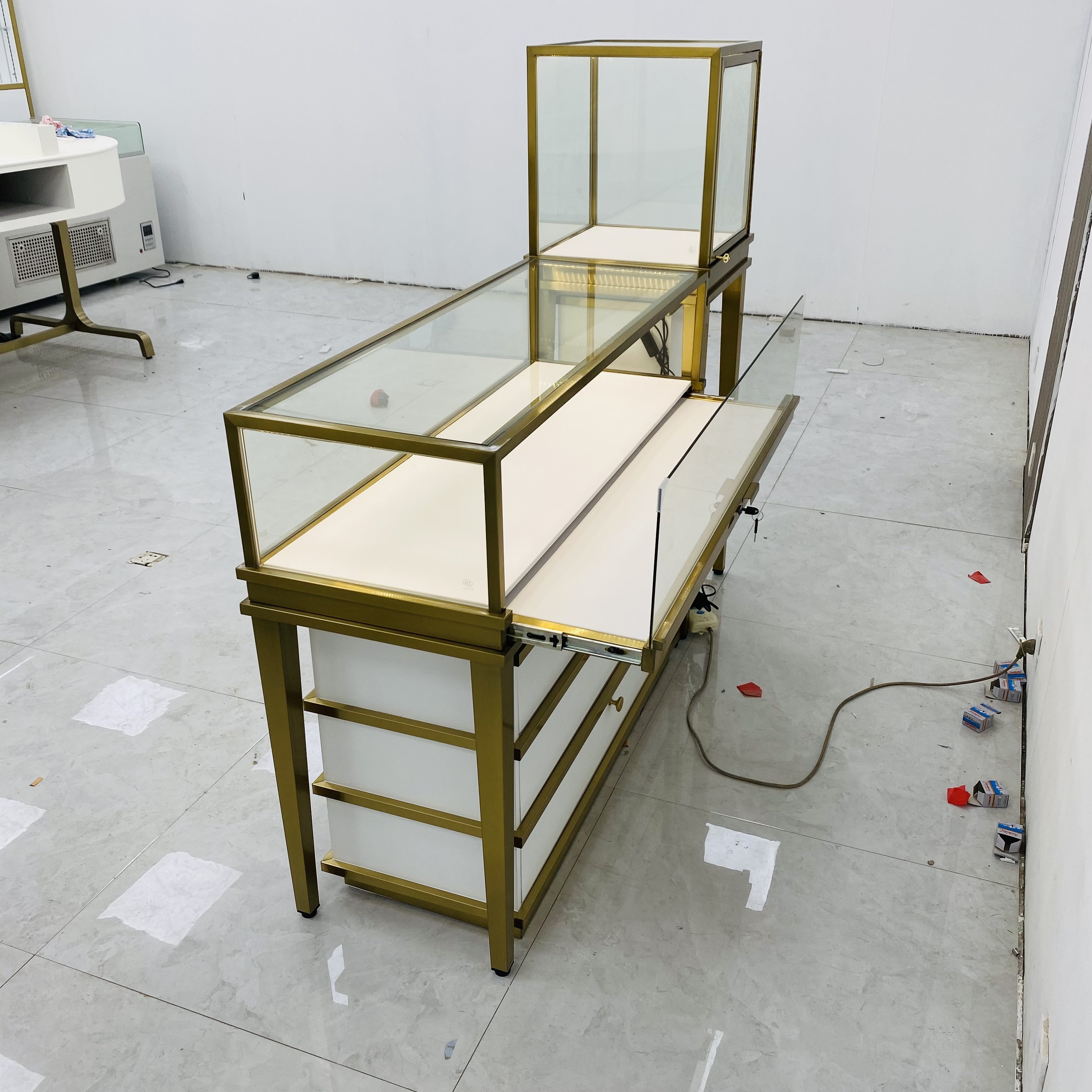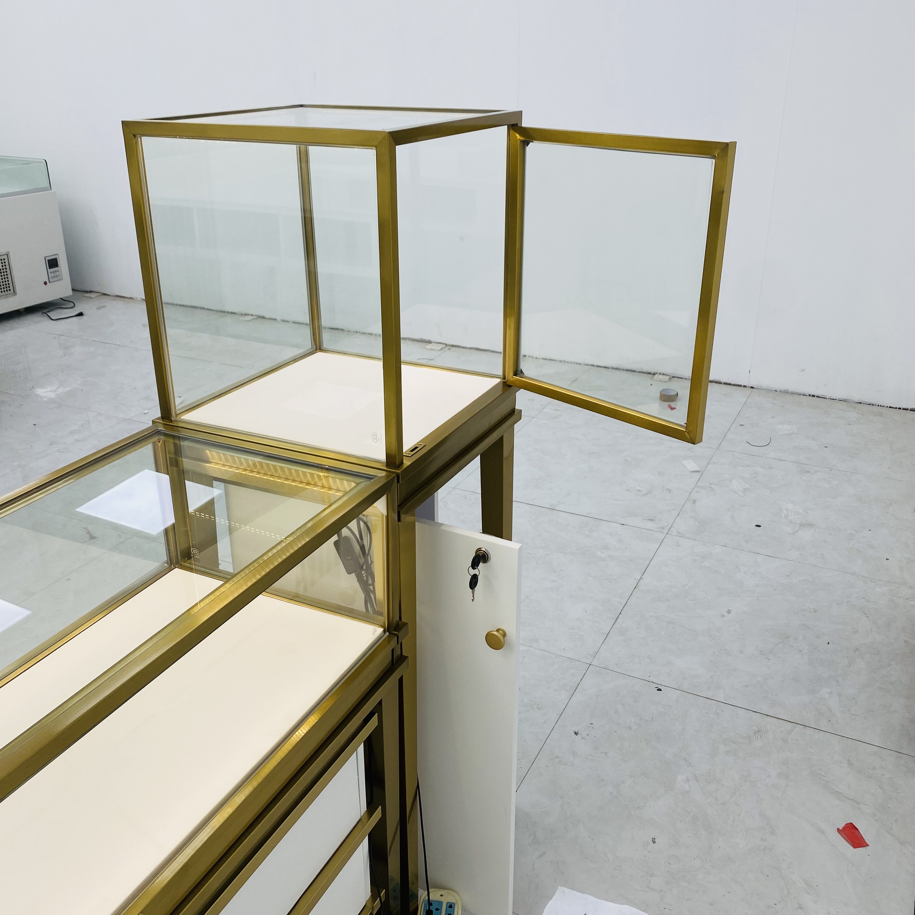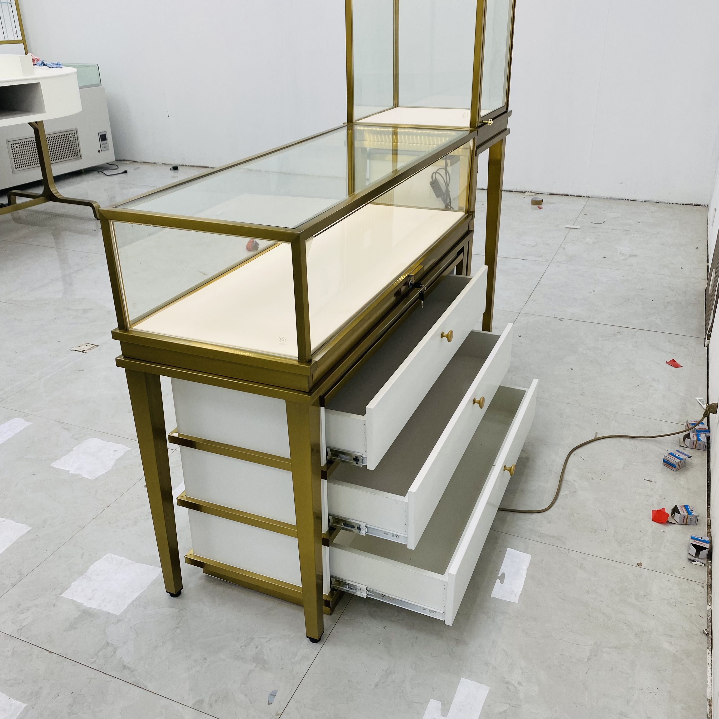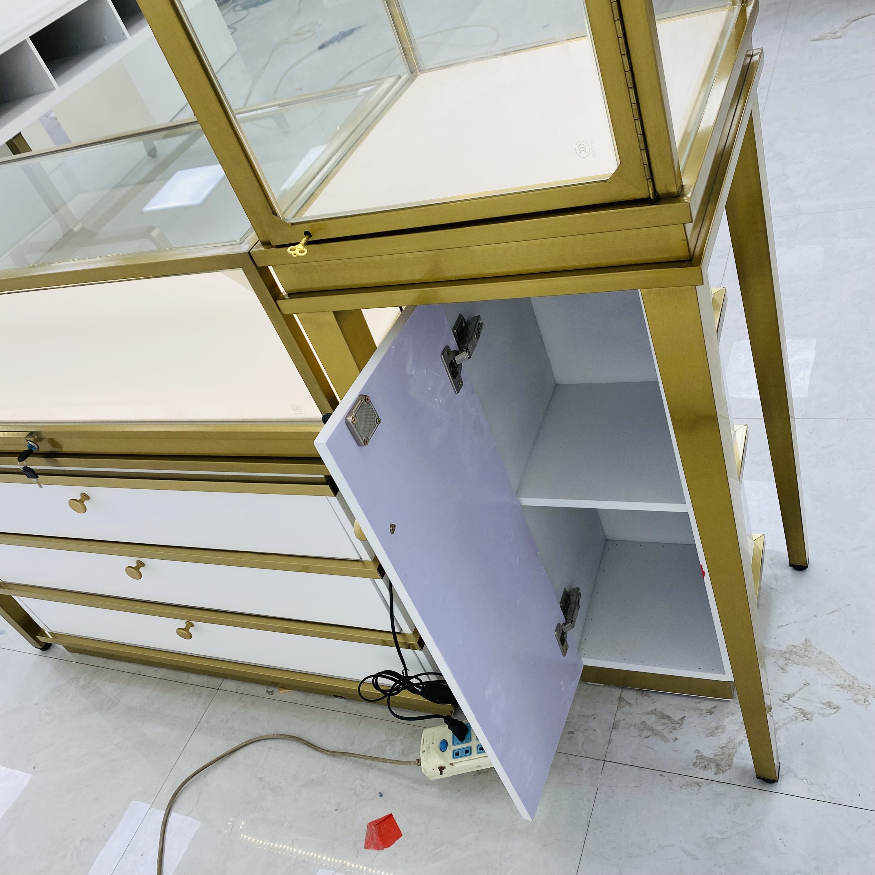 Il s'agit d'une armoire d'affichage en verre personnalisée avec des attributs à plusieurs niveaux. Il est composé d'une armoire à haute hauteur et d'une armoire à basse hauteur. L'armoire avant mesure L120 * W55 * H95CM, tandis que l'armoire verticale mesure L55 * W55 * H140cm..L'Arsitation dispose d'un cadre en fer métallique, garantissant la robustesse et la durabilité. Il est composé de verre trempé transparent de 8 mm, offrant une vue claire des articles à l'intérieur tout en offrant une sécurité. L'intérieur est bordé de cuir PU blanc, donnant une apparence douce et élégante. L'armoire de base a des tiroirs à trois niveaux, qui offrent un grand espace de stockage. L'armoire de base est bordée en acier inoxydable, améliorant son attrait esthétique et sa durabilité.