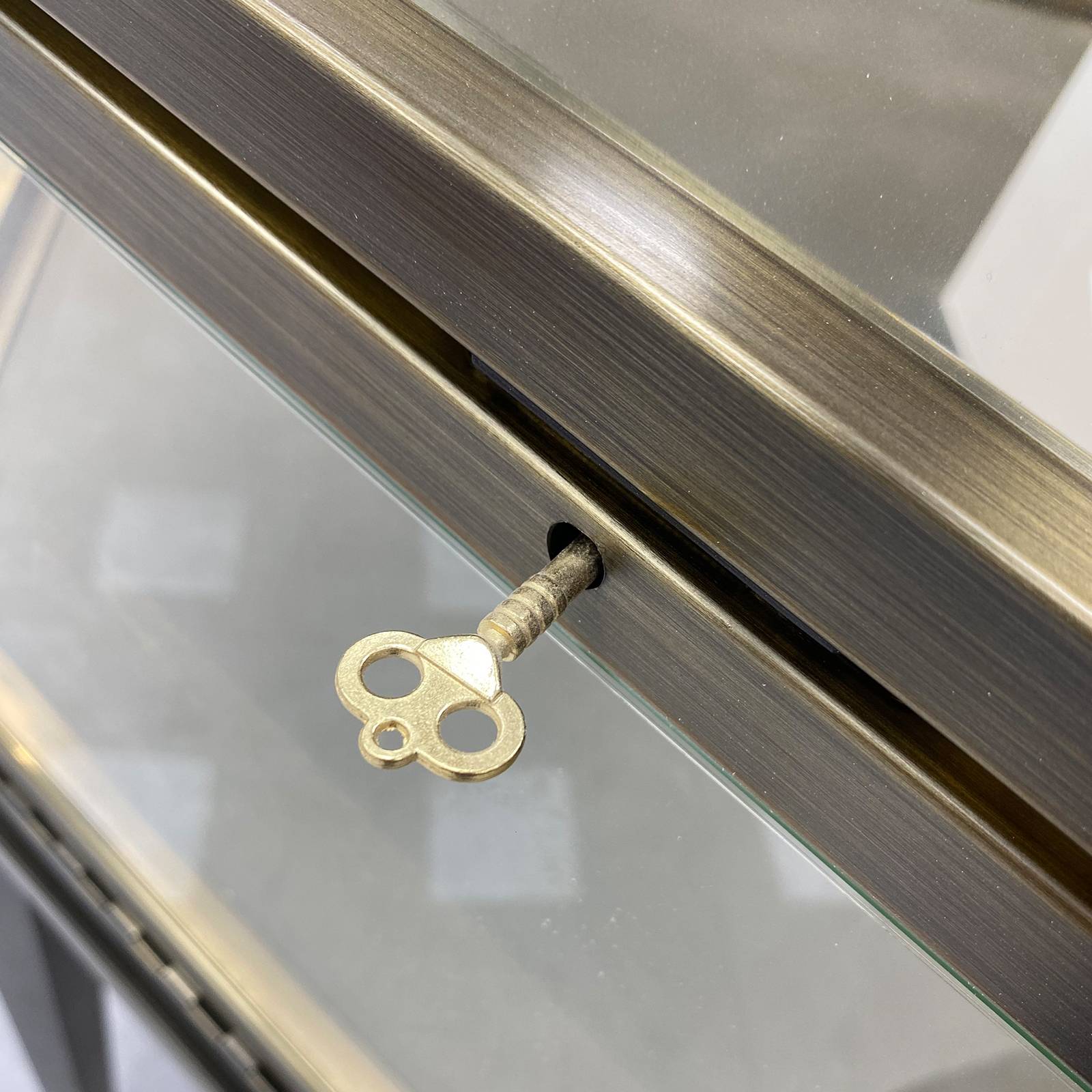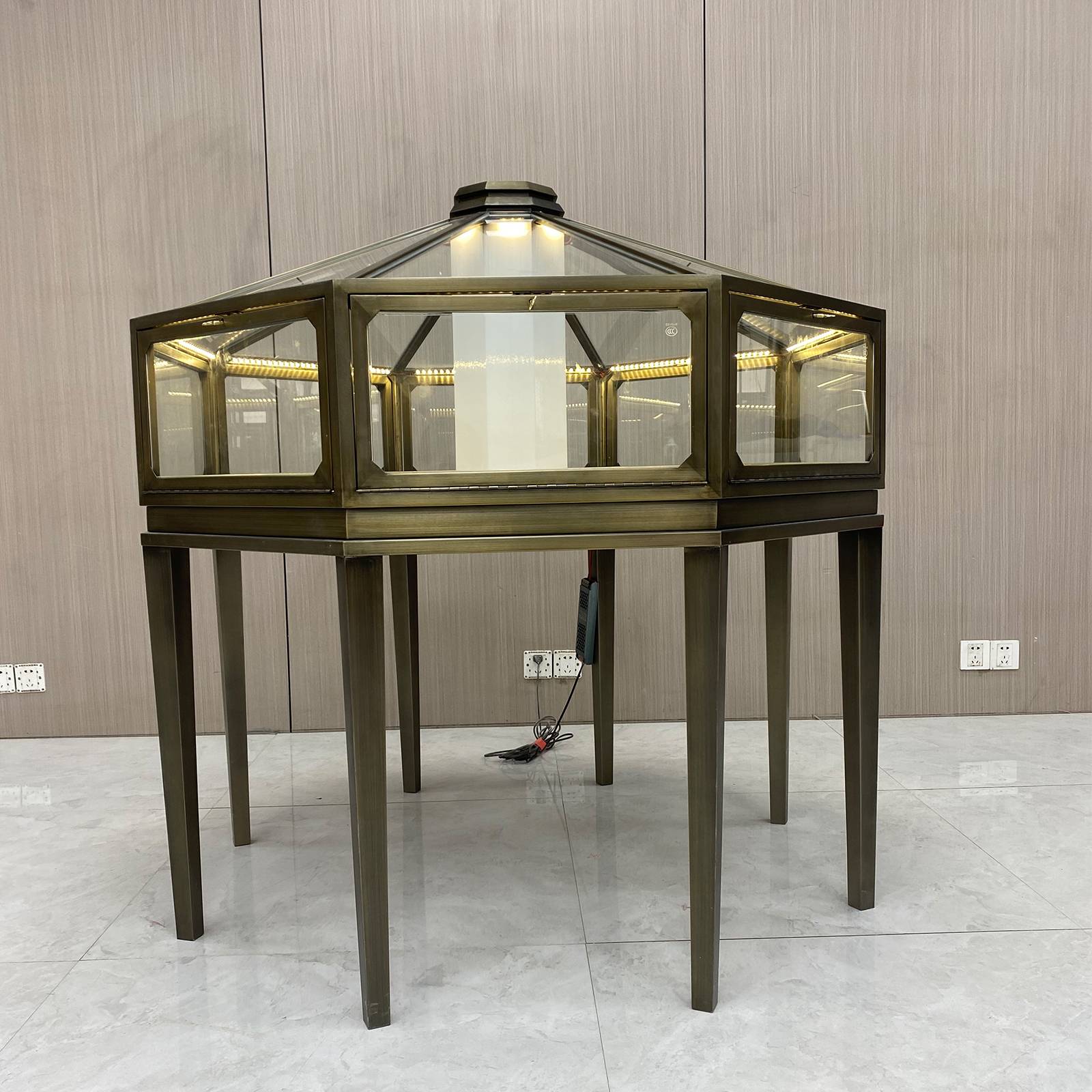 Cette armoire d'affichage de bijoux de mode est très durable. La taille est L120 * W120 * 95cm.Il est en acier inoxydable de couleur bronze avec une finition brossée, ce qui lui donne non seulement une apparence élégante mais assure également sa robustesse et sa résistance à l'usure. L'armoire dispose d'un verre trempé transparent de 8 mm. Ce type de verre est connu pour sa force et sa durabilité, capables de résister aux impacts et de fournir une vue claire et dégagée des bijoux à l'intérieur. La combinaison du cadre en acier robuste en acier inoxydable et du verre trempé dur fait de cette armoire d'affichage un choix durable et fiable pour présenter des bijoux de mode.