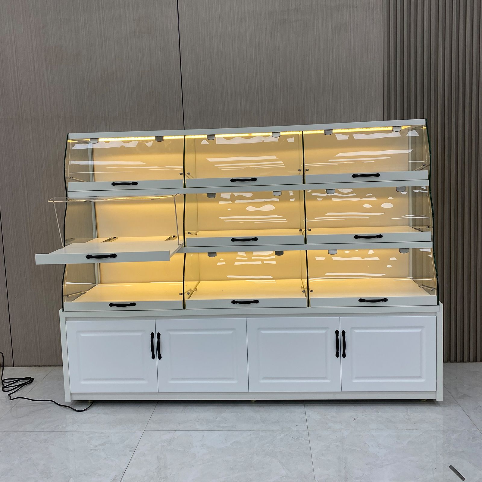 Il s'agit d'une armoire d'affichage à pain debout à plancher laqué blanc. Premièrement, la couleur de l'armoire peut être personnalisée en fonction de vos préférences. L'armoire est équipée de plusieurs partitions en verre, qui sont utiles pour séparer différents types de pain ou de pâtisseries. Cette conception maintient non seulement les articles organisés, mais permet également aux clients d'avoir une vue claire des produits à l'intérieur. L'armoire a également des portes coulissantes, qui sont pratiques pour accéder au pain. De plus, au bas de l'armoire, il y a un casier de stockage de grande capacité, qui est idéal pour stocker du pain supplémentaire ou des articles connexes.